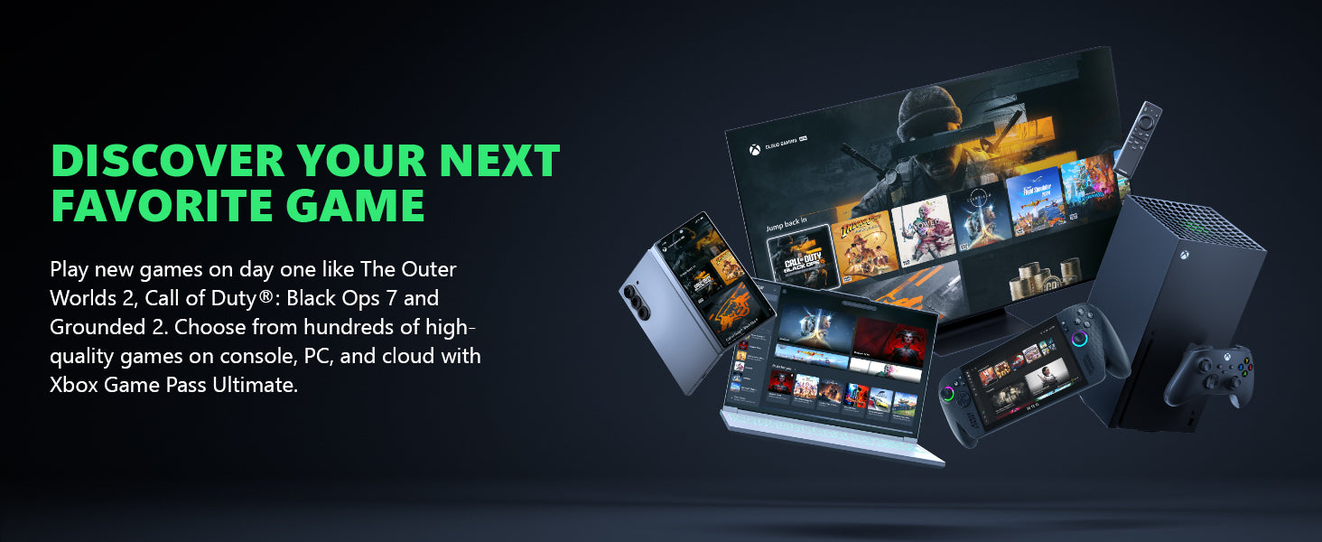 - Play new games on day one like The Outer Worlds 2, Call of Duty: Black Ops 7, and Grounded 2. Choose from hundreds of high-quality games on console, PC, and cloud with Xbox Game Pass Ultimate.